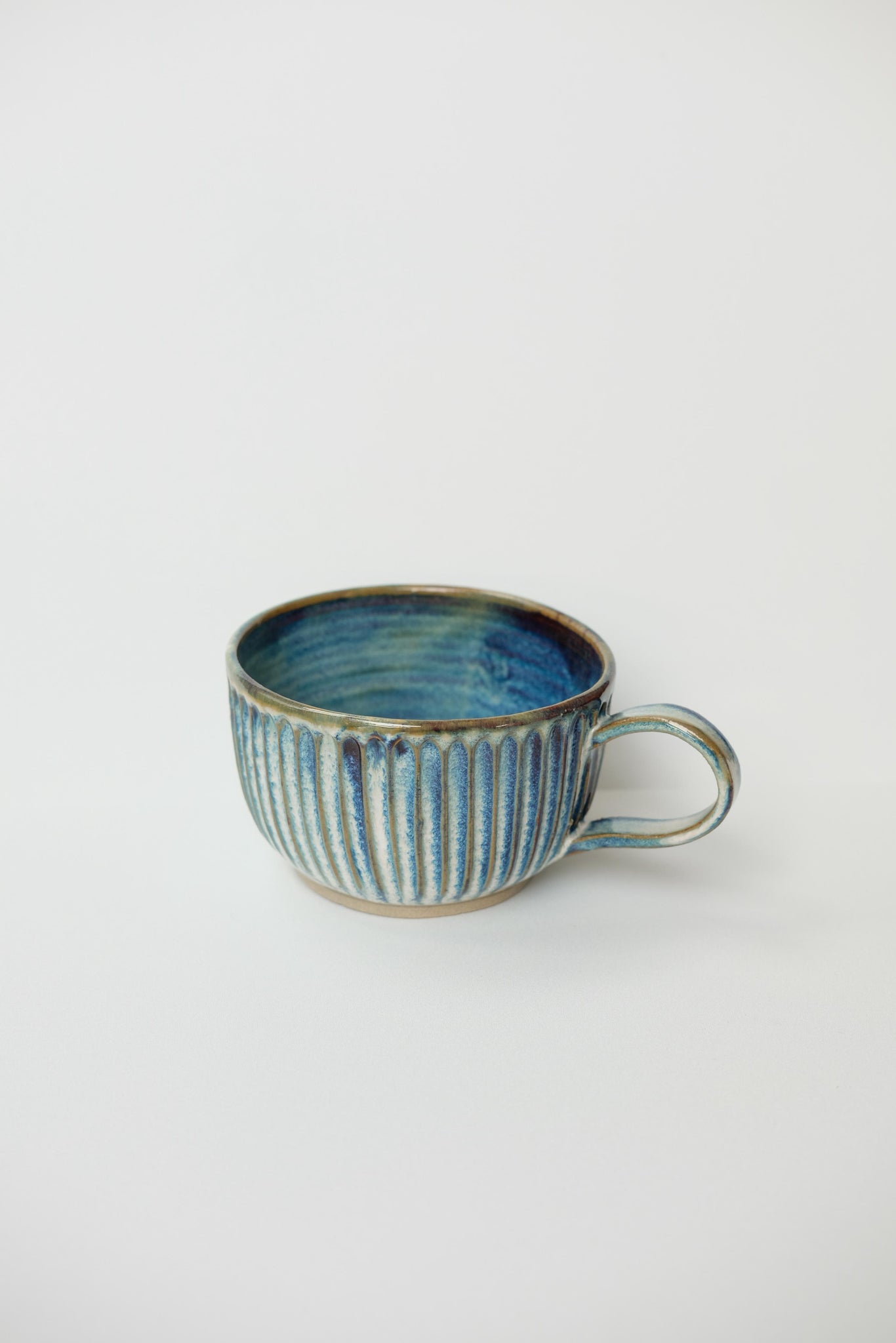 Tenmoku is made from feldspar, limestone and iron oxide. This glaze is also mixed with Titanium to give it its metallic blue gradient The more quickly a piece is cooled, the blacker the glaze will be. Tenmokus are known for their variability, ranging from dark to light with layers to create depth and dimension.