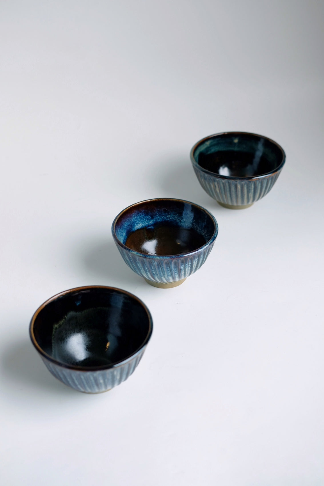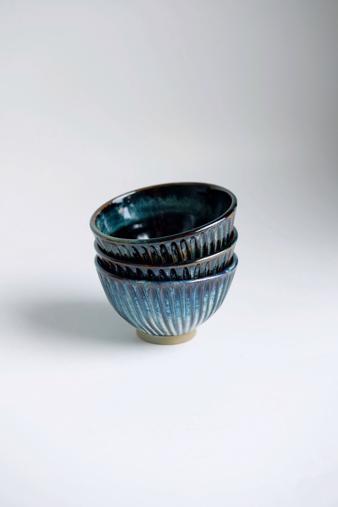 Tenmoku is made from feldspar, limestone and iron oxide. This glaze is also mixed with Titanium to give it its metallic blue gradient The more quickly a piece is cooled, the blacker the glaze will be. Tenmokus are known for their variability, ranging from dark to light with layers to create depth and dimension.