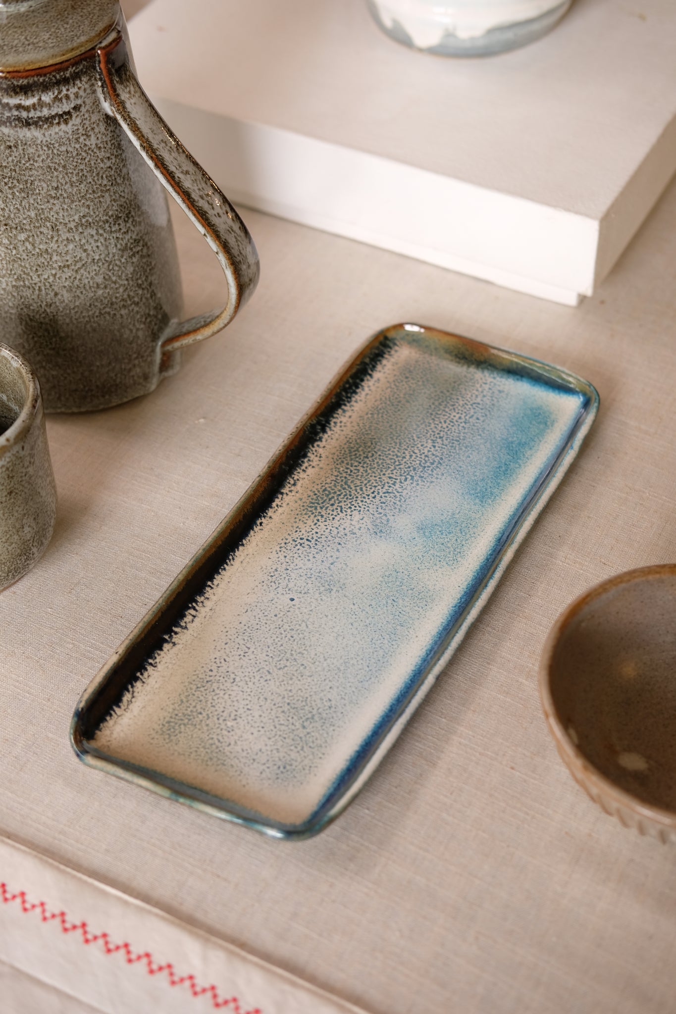 Tenmoku is made from feldspar, limestone and iron oxide. This glaze is also mixed with Titanium to give it its metallic blue gradient The more quickly a piece is cooled, the blacker the glaze will be. Tenmokus are known for their variability, ranging from dark to light with layers to create depth and dimension.